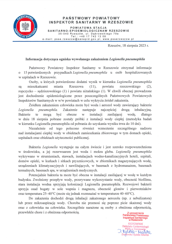 Komunikat Państwowego Powiatowego Inspektora Sanitarnego w Rzeszowie w sprawie ogniska wywołanego zakażeniem Legionella pneumophila z dnia 18.08.2023r.