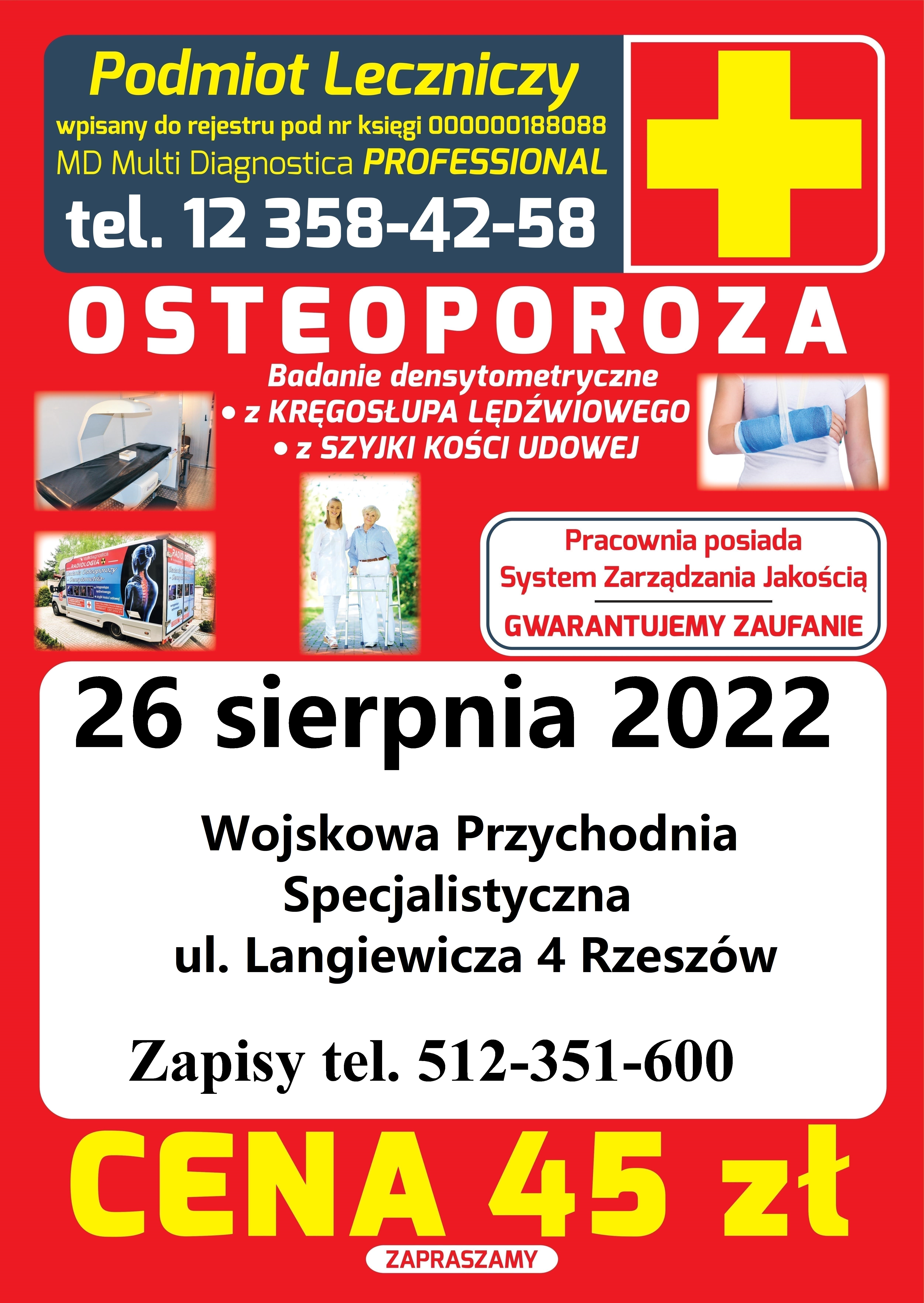 RZESZÓW. Mieszkańcy Rzeszowa i okolic będą mieli możliwość zbadania swoich kości w “osteobusie”. Data i miejsce badania: 26 sierpnia 2022 – Rzeszów – Wojskowa Przychodnia Specjalistyczna ul. Langiewicza 4.