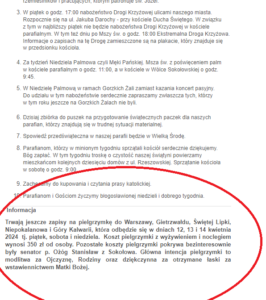 Trwają jeszcze zapisy na pielgrzymkę do Warszawy, Gietrzwałdu, Świętej Lipki, Niepokalanowa i Góry Kalwarii, która odbędzie się w dniach 12, 13 i 14 kwietnia 2024 tj. piątek, sobota i niedziela. Koszt pielgrzymki z wyżywieniem i noclegiem wynosi 350 zł od osoby – informuje parafia w Sokołowie Małopolskim.