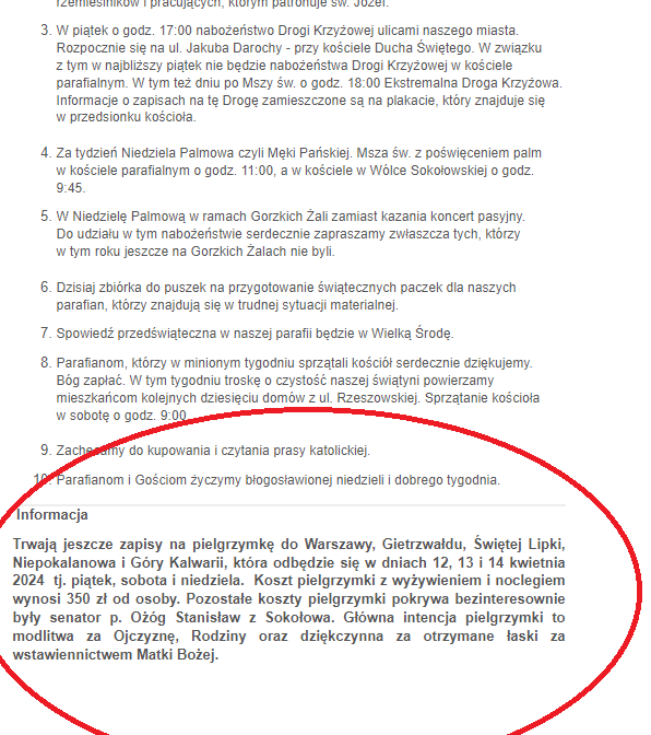 SOKOŁÓW MŁP. Część kosztów pielgrzymki pokryje były senator Prawa i Sprawiedliwości Stanisław Ożóg. O sytuacji informuje miejscowa parafia.