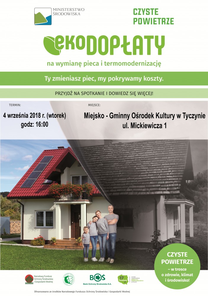 Już dziś tj. 4 września o godz. 16 w Miejsko ? Gminnym Ośrodku Kultury w Tyczynie odbędzie się spotkanie pn. ?EkoDopłaty na wymianę pieca i termomodernizację”.