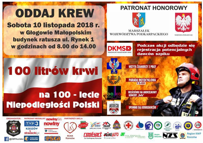 Zbiórka odbędzie się 10 listopada 2018r. (sobota) w godz. 8 – 14 w Głogowie Małopolskim przy Urzędzie Miejskim ul. Rynek 1. W setną rocznicę odzyskania przez Polskę niepodległości chcemy nawiązać do tych wydarzeń i zbiórkę krwi nazywamy „100 litrów krwi na 100-lecie Niepodległości Polski” – informują organizatorzy.