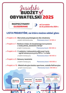 Głosować może (elektronicznie lub osobiście) każdy mieszkaniec Jasła, który ukończył 13 lat, a do oddania są dwa głosy – jeden na projekty inwestycyjne, drugi na nieinwestycyjne. Głosowanie potrwa do 25 października.