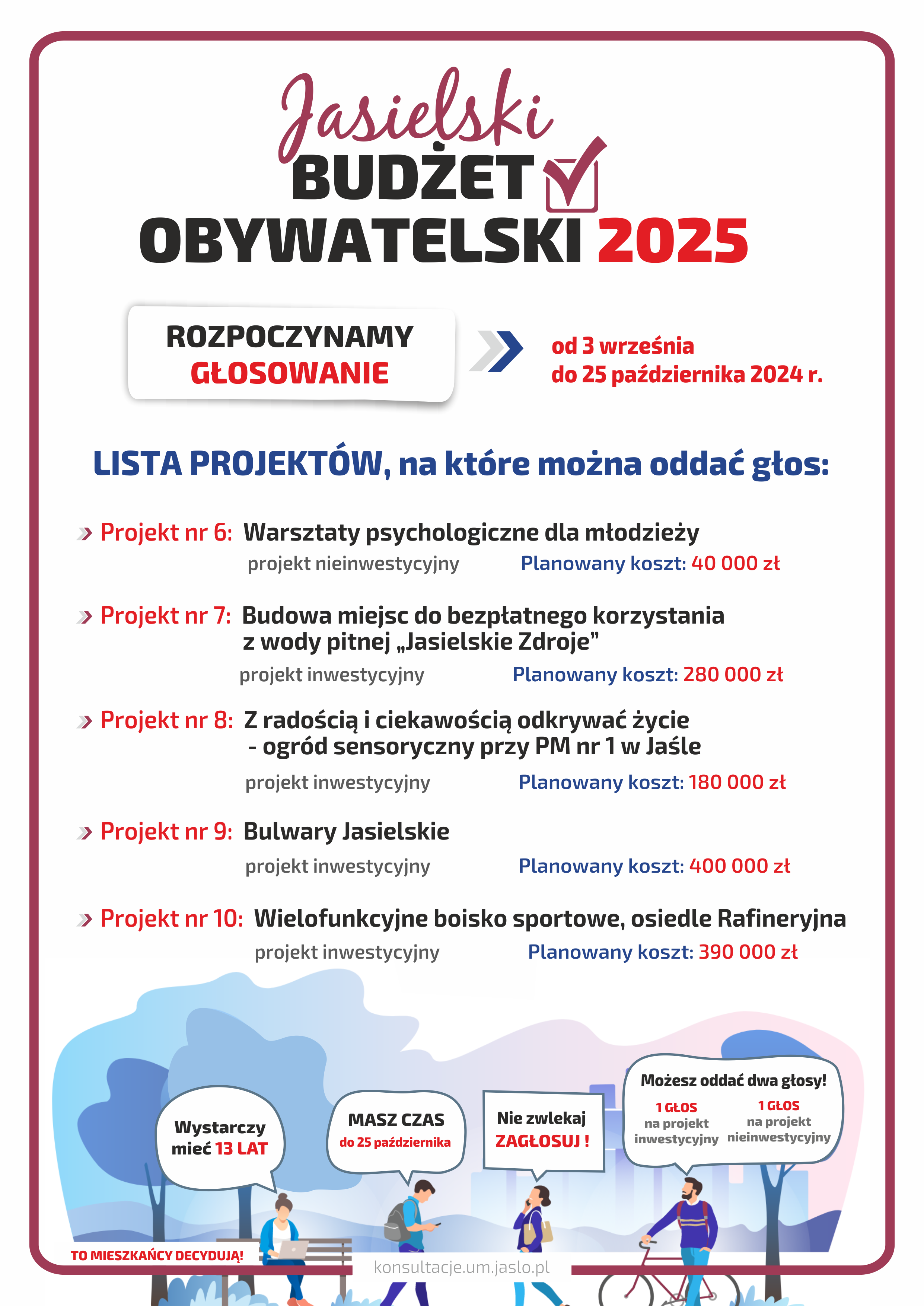 Głosować może (elektronicznie lub osobiście) każdy mieszkaniec Jasła, który ukończył 13 lat, a do oddania są dwa głosy – jeden na projekty inwestycyjne, drugi na nieinwestycyjne. Głosowanie potrwa do 25 października.