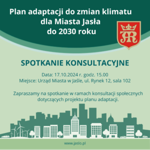W związku z trwającymi konsultacjami społecznymi projektu Planu adaptacji do zmian klimatu dla Miasta Jasła do 2030 roku, zapraszamy na otwarte spotkanie, które odbędzie się 17 października w Urzędzie Miasta w Jaśle, w sali 102 o godz. 15.