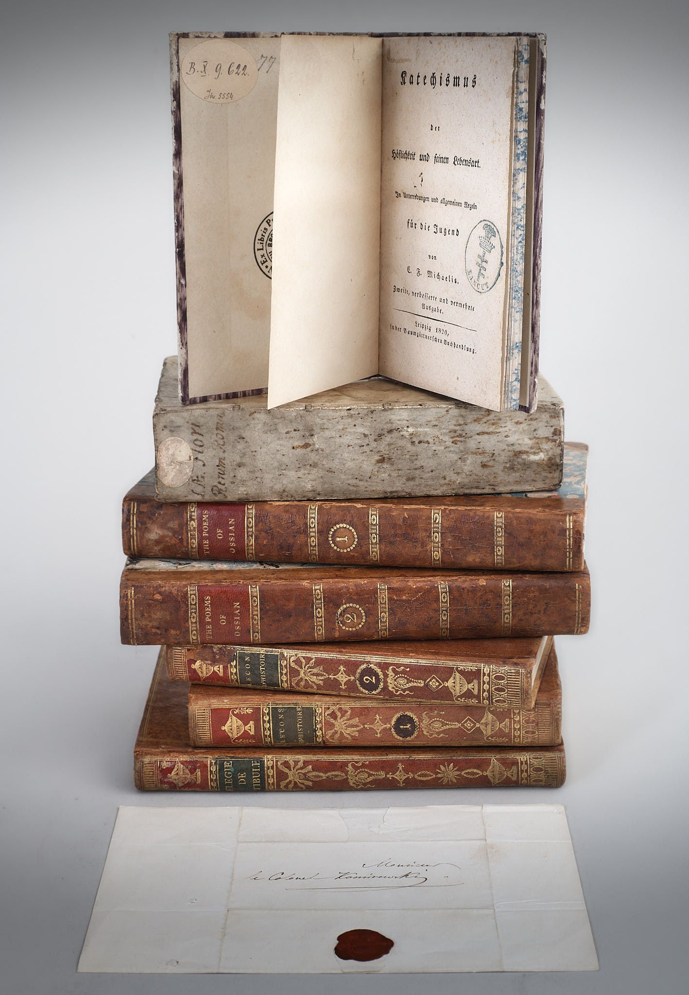 Wśród przekazanych książek znalazły się: „Katechismus der HoeflichkeitundfeinenLebensart” Chrystiana Fryderyka Michaelisa (Lipsk, 1820), „Essai sur lesElegies de Tibulle” Tibullusa (Paryż, 1779), w dwóch tomach „LeconsElementairesd’Histoire et Chronologie” Louisa MayeulChaudona (Caen, 1783), z dawnego księgozbioru komendanta twierdzy Kamieńca Podolskiego Jana de Wittego „L.A. Florus cum integris Cl. Salmasii et variorum notis” (Nijmaggen, 1662), a takżedwutomowe „The Poems of Ossian” JamesaMacphersona (Londyn, 1773).