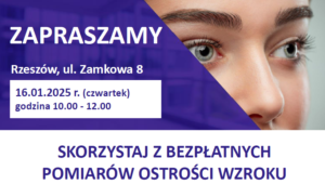 Darmowe badania wzroku – skorzystaj z profesjonalnej diagnostyki bez żadnych kosztów! Bezpłatny serwis okularów – regulacja i czyszczenie w trosce o Twój komfort widzenia. Dostępne dla każdego – 16 stycznia w siedzibie Podkarpackiego NFZ w Rzeszowie przy ul. Zamkowej 8. Dodatkowo sprawdzisz parametry swojego organizmu w kiosku profilaktycznym i w 10 minut dostaniesz wynik.