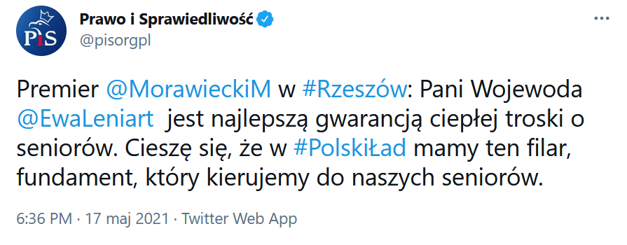 Pani Wojewoda Ewa Leniart jest najlepszą gwarancją ciepłej troski o seniorów. Cieszę się, że w Polskim Ładzie mamy ten filar, fundament, który kierujemy do naszych seniorów – powiedział wczoraj Mateusz Morawiecki.