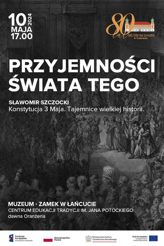 W piątek 10 maja 2024 r. Muzeum-Zamek w Łańcucie zaprasza na kolejne wydarzenie z cyklu „Przyjemności świata tego”. Gościem spotkania będzie Sławomir Szczocki z Działu Edukacji Zamku Królewskiego w Warszawie, który przedstawi historię Ustawy Rządowej Rzeczypospolitej Obojga Narodów, powszechnie znanej jako Konstytucja 3 maja.