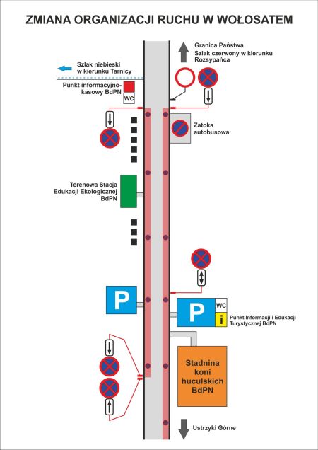 Informujemy, że z dniem 19-04-2019 r. (piątek), w osadzie Wołosate położonej w Bieszczadzkim Parku Narodowym, zostanie wprowadzona nowa organizacja ruchu drogowego przy Drodze Wojewódzkiej nr 897 . Prosimy o zapoznanie się ze schematyczną mapą (poniżej) i korzystanie zarówno z dawnego (w pierwszej kolejności), jak i nowego parkingu (po uruchomieniu) zlokalizowanych przy wjeździe do osady. W samej osadzie nie parkujemy. Do punktu informacyjno-kasowego oraz wejścia na szlak niebieski w kierunku Tarnicy i czerwony w kierunku Rozsypańca idziemy pieszo z parkingów drogą główną (około 7 minut) – czytamy w dzisiejszym komunikacie Parku.