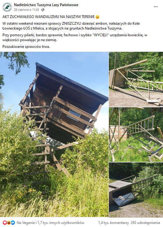 Przy pomocy pilarki, bardzo sprawnie, fachowo i szybko „WYCIĘLI” urządzenia łowieckie, w większości powalając je na ziemię. Poszukiwanie sprawców trwa – czytamy dalej.