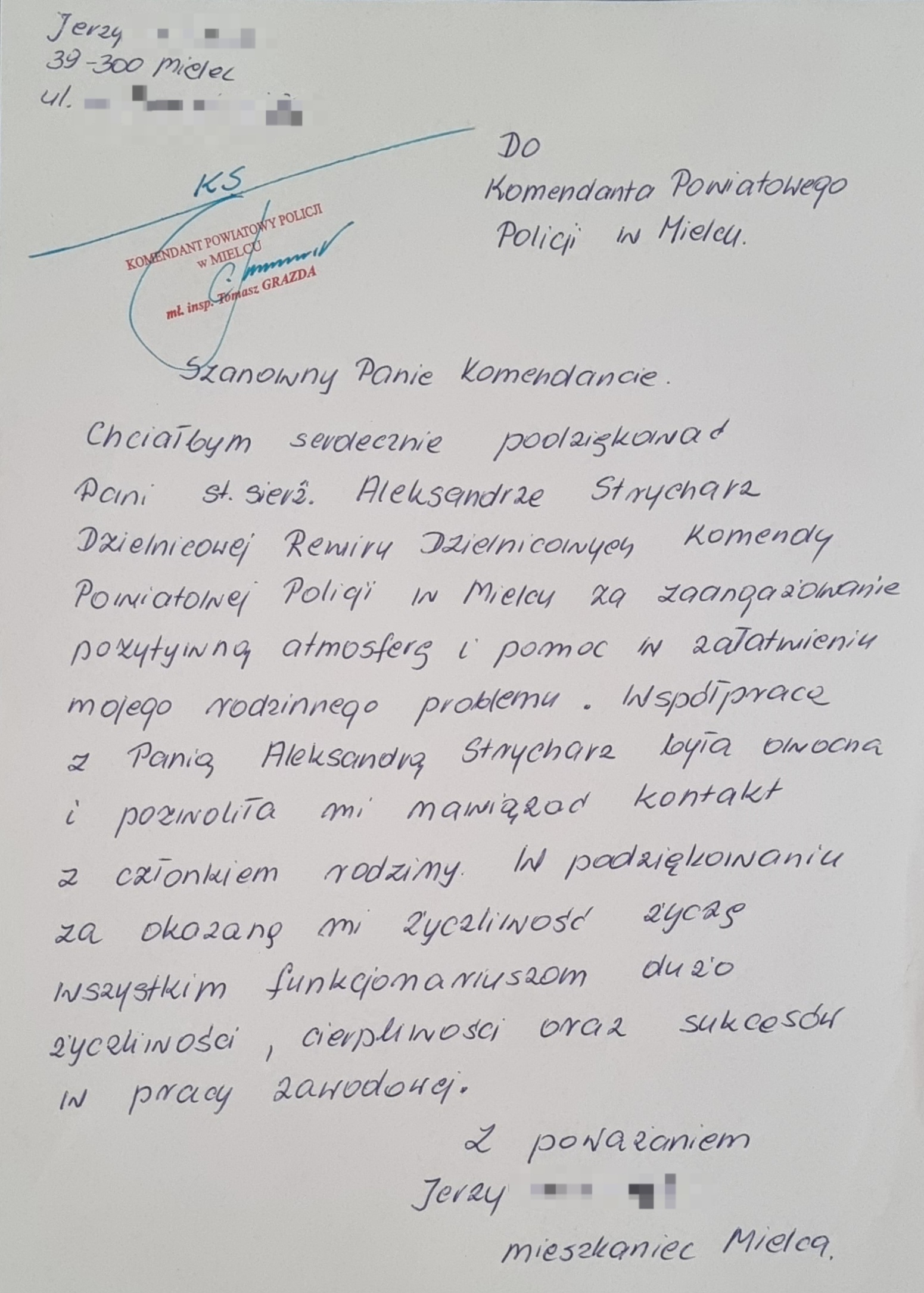 Na ręce Komendanta Powiatowego Policji w Mielcu wpłynęły podziękowania dla dzielnicowej z Rewiru Dzielnicowych w Mielcu – st. sierż. Aleksandry Strycharz. Miłe słowa skierował Pan Jerzy, który docenił zaangażowanie dzielnicowej w pomocy przy rozwiązaniu rodzinnego problemu.
