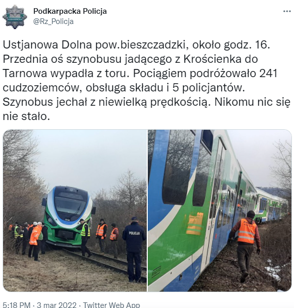 Ustjanowa Dolna pow.bieszczadzki, około godz. 16. Przednia oś szynobusu jadącego z Krościenka do Tarnowa wypadła z toru. Pociągiem podróżowało 241 cudzoziemców, obsługa składu i 5 policjantów. Szynobus jechał z niewielką prędkością. Nikomu nic się nie stało – poinformowała na Twitterze Podkarpacka Policja.