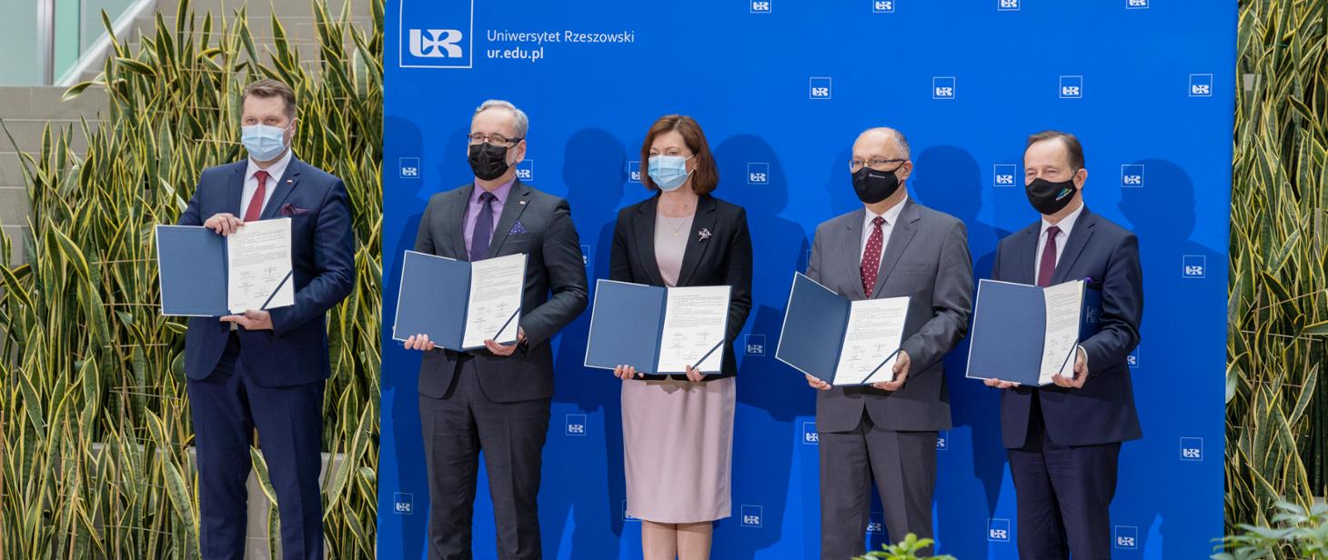 Dziś, 14 maja br. w Rzeszowie podpisano deklarację dotyczącą wspólnych działań na rzecz powstania szpitala uniwersyteckiego. Podpisy pod dokumentem złożyli: Minister Edukacji i Nauki Przemysław Czarnek, Minister Zdrowia Adam Niedzielski, Wojewoda Podkarpacki Ewa Leniart, Marszałek Województwa Podkarpackiego Władysław Ortyl oraz Rektor Uniwersytetu Rzeszowskiego prof. Sylwester Czopek. Deklaracja to kontynuacja działań podjętych w listopadzie 2016 r. w ramach porozumienia stron na rzecz rozwoju kształcenia i rozwoju systemu ochrony zdrowia w województwie.