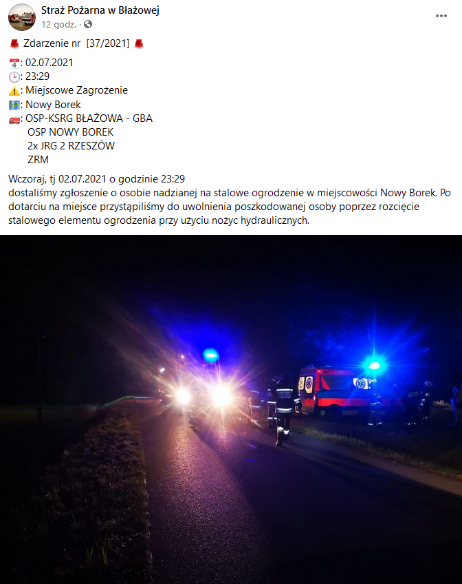 Wczoraj, tj 02.07.2021 o godzinie 23:29 dostaliśmy zgłoszenie o osobie nadzianej na stalowe ogrodzenie w miejscowości Nowy Borek. Po dotarciu na miejsce przystąpiliśmy do uwolnienia poszkodowanej osoby poprzez rozcięcie stalowego elementu ogrodzenia przy użyciu nożyc hydraulicznych – poinformowała na facebooku Straż Pożarna w Błażowej.