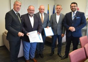 Dziś tj. 1 sierpnia, w siedzibie Starostwa Powiatowego w Rzeszowie, została podpisana umowa na realizację inwestycji w obszarze infrastruktury drogowo-mostowej pomiędzy POWIATEM RZESZOWSKIM – Zarządem Dróg Powiatowych w Rzeszowie a firmą Wolmost Spółka z o.o. z siedzibą w Rzeszowie. W spotkaniu uczestniczył Józef Jodłowski – Senator RP, dr Krzysztof Jarosz – Starosta Rzeszowski oraz Jerzy Bednarz Wicestarosta Rzeszowski.