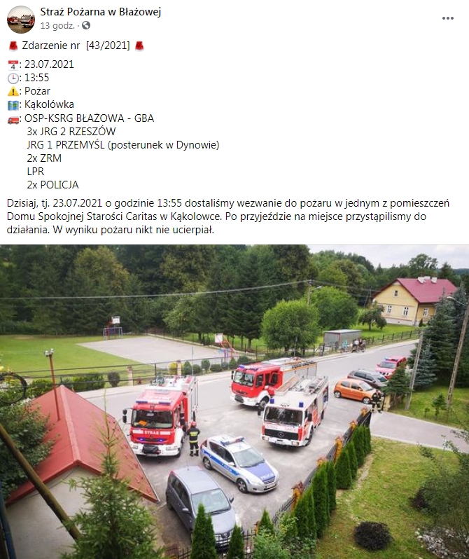Wczoraj o godzinie 13:55 Straż Pożarna w Błażowej dostała wezwanie do pożaru w jednym z pomieszczeń Domu Spokojnej Starości Caritas w Kąkolowce.