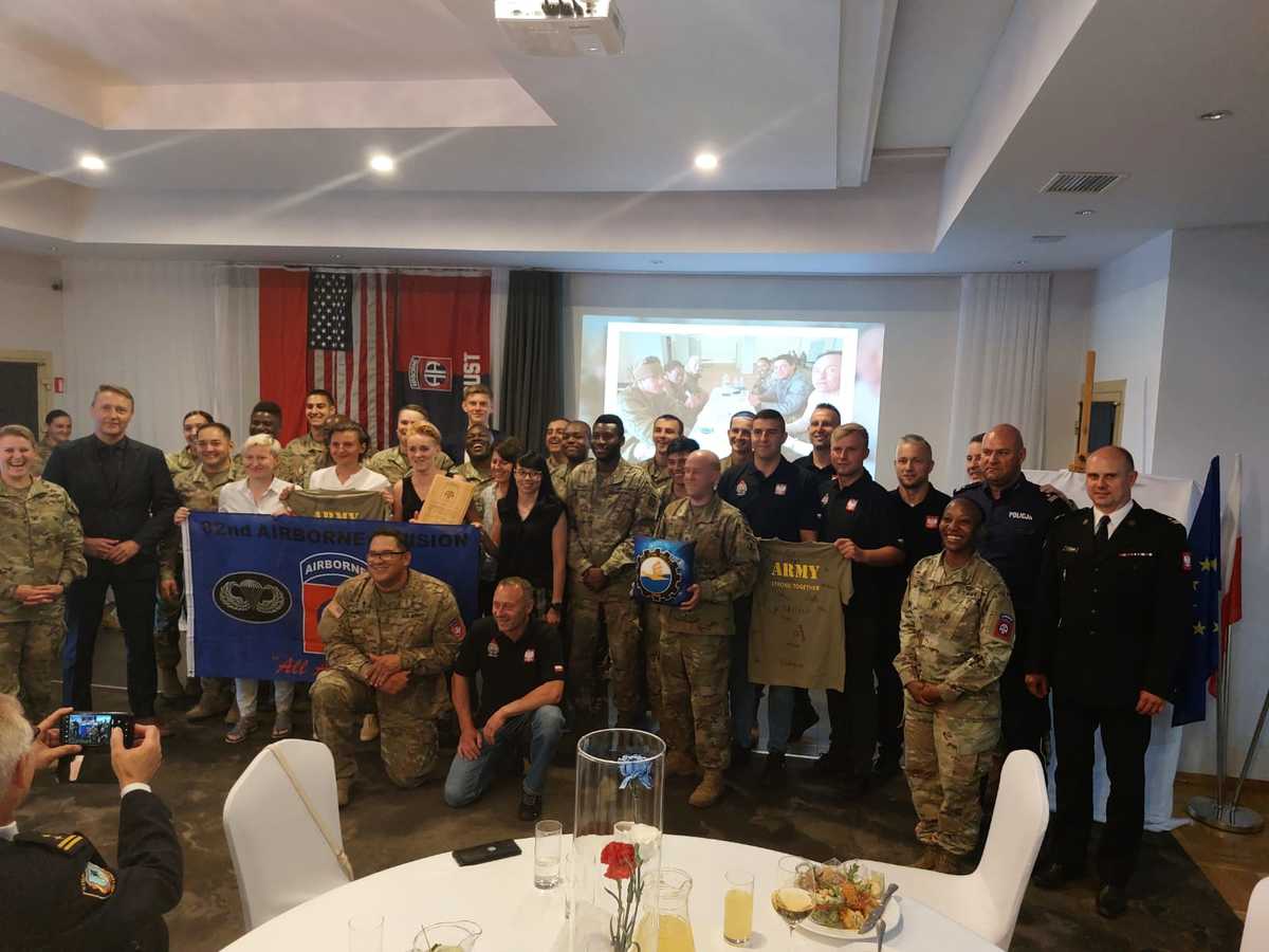Policjanci przyjęli zaproszenie na pożegnalne spotkanie zorganizowane przez przedstawicieli 82 Dywizji Powietrznodesantowej stacjonującej od kilku miesięcy na terenie mieleckiego lotniska. W spotkaniu udział wziął I Zastępca Komendanta Wojewódzkiego Policji w Rzeszowie insp. Stanisław Sekuła, Komendant Powiatowy Policji w Mielcu podinsp. Tomasz Grazda, Naczelnik Wydziału Prewencji mieleckiej jednostki kom. Bartosz Gracz, a także przedstawiciele Międzynarodowego Stowarzyszenia Policji IPA Region Mielec. W spotkaniu wziął również udział Komendant Powiatowy Powiatowej Państwowej Straży Pożarnej w Mielcu mł. bryg. Łukasz Kapionos oraz Prezydent Miasta Mielca Jacek Wiśniewski.
