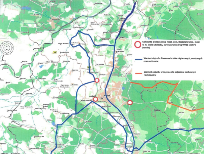 - na trasie Tarnobrzeg – Mielec – Dębica – Mielec – Tarnobrzeg – pojazdy będą kierowane drogą powiatową nr 1161 R przez Mielec ul. Wojsławską – Sienkiewicza i miejscowościami Chorzelów – Tuszów Narodowy – Jaślany.