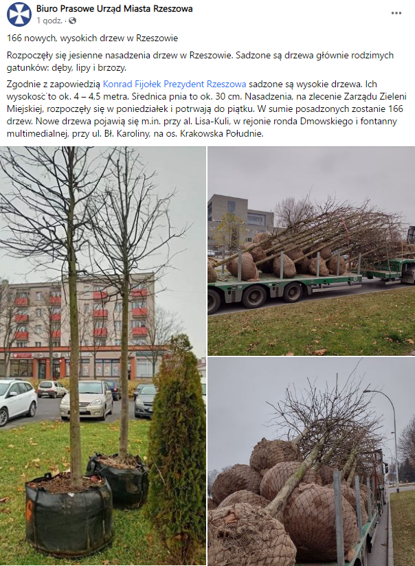 Zgodnie z zapowiedzią Konrada Fijołka prezydent Rzeszowa sadzone są wysokie drzewa. Ich wysokość to ok. 4 – 4,5 metra. Średnica pnia to ok. 30 cm. Nasadzenia, na zlecenie Zarządu Zieleni Miejskiej, rozpoczęły się w poniedziałek i potrwają do piątku. W sumie posadzonych zostanie 166 drzew. Nowe drzewa pojawią się m.in. przy al. Lisa-Kuli, w rejonie ronda Dmowskiego i fontanny multimedialnej, przy ul. Bł. Karoliny, na os. Krakowska Południe – poinformowało biuro prasowe Urzędu Miasta Rzeszowa.