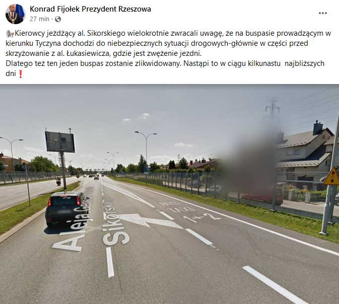 Kierowcy jeżdżący al. Sikorskiego wielokrotnie zwracali uwagę, że na buspasie prowadzącym w kierunku Tyczyna dochodzi do niebezpiecznych sytuacji drogowych-głównie w części przed skrzyżowanie z al. Łukasiewicza, gdzie jest zwężenie jezdni – poinformował prezydent Rzeszowa Konrad Fijołek.