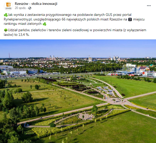 Jak wynika z zestawienia przygotowanego na podstawie danych GUS przez portal Rynekpierwotny.pl, uwzględniającego 66 największych polskich miast Rzeszów na 2 miejscu rankingu miast zielonych.