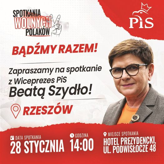 W niedzielę 28 stycznia 2024 r. w Hotelu Prezydenckim w Rzeszowie przy ul. Podwisłocze 48, odbędzie się spotkanie z byłą premier RP Beatą Szydło.