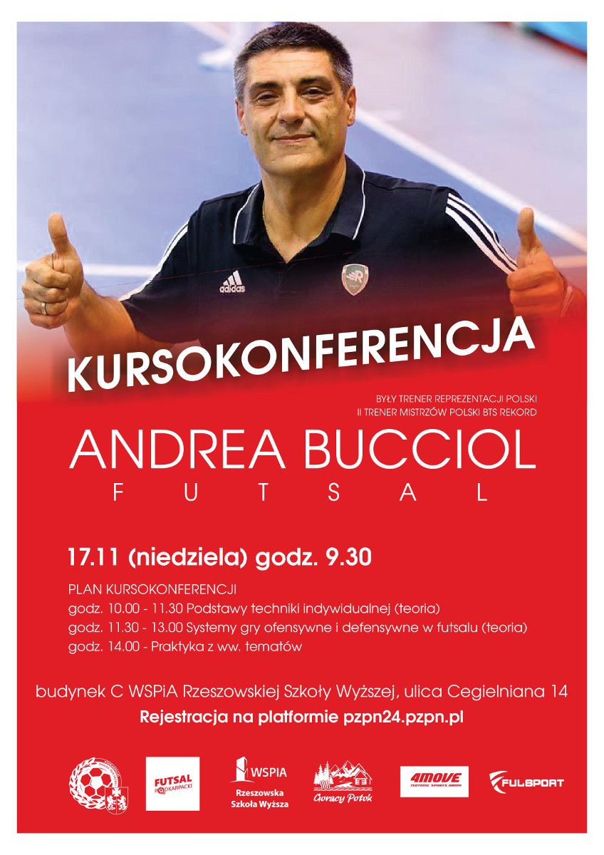Andrea Bucciol – były selekcjoner kadry Polski w Futsalu, obecnie II trener zespołu mistrza Polski Rekordu Bielsko-Biała będzie gościem WSPiA Rzeszowskiej Szkoły Wyższej. W najbliższą niedzielę weźmie udział w specjalnej kursokonferencji z Futsalu. Organizatorem przedsięwzięcia jest WSPiA, Klub Uczelniany AZS oraz Wydział Futsalu Podkarpackiego Związku Piłki Nożnej.