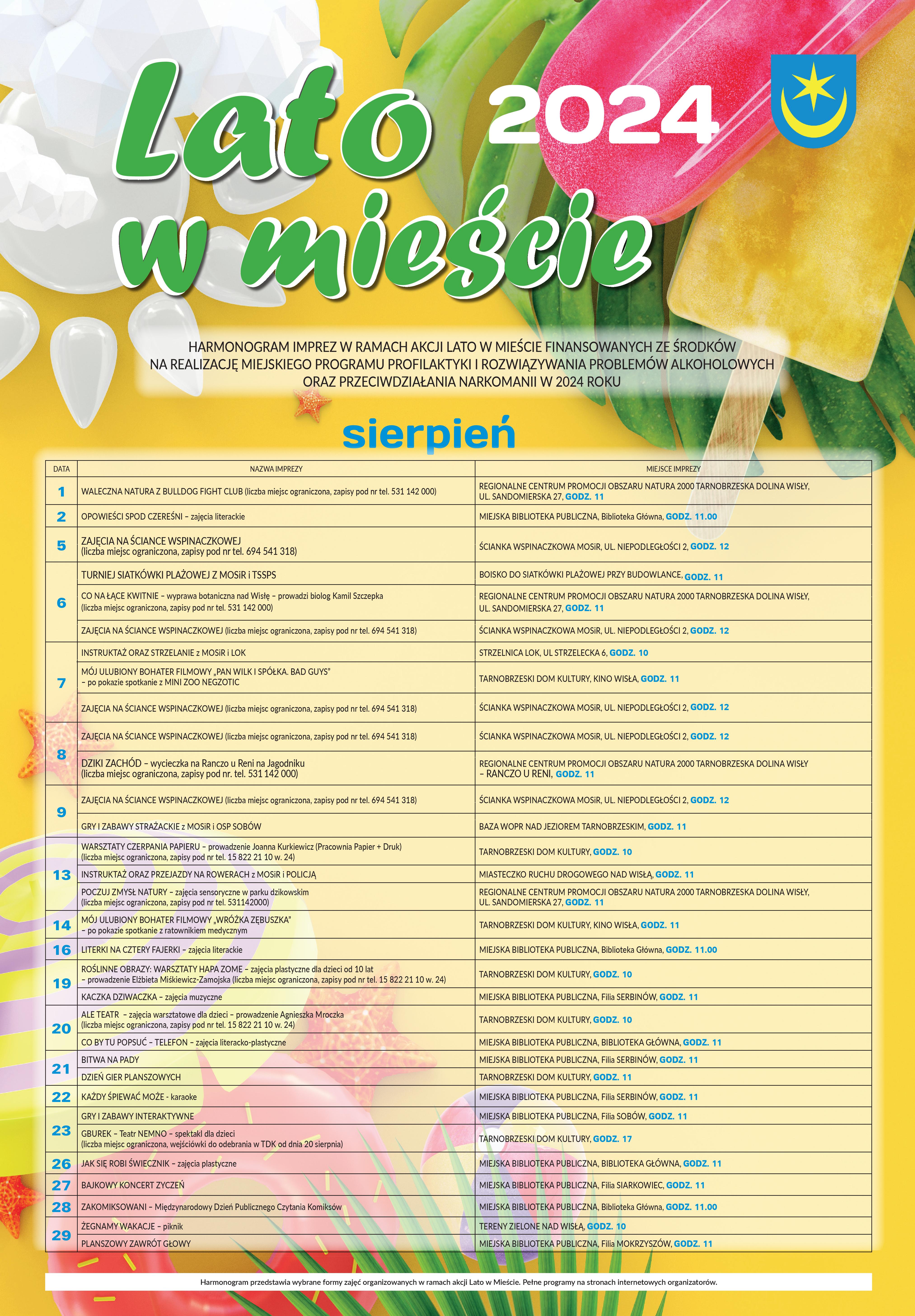 Sierpniowa oferta „Lato w mieście”. Poniżej wydarzenia przygotowane m.in. przez Tarnobrzeski Dom Kultury, Miejski Ośrodek Sportu i Rekreacji, Miejską Bibliotekę Publiczną oraz Regionalne Centrum Promocji Obszaru Natura 2000 „Tarnobrzeska Dolina Wisły”.