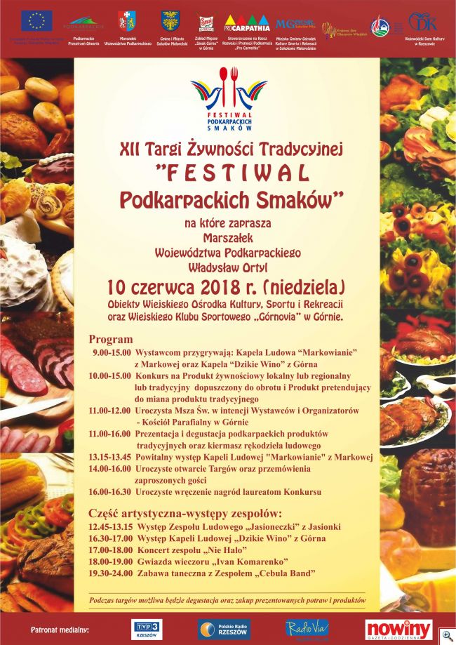 Już w najbliższą niedzielę tj. 10 czerwca na obiektach Wiejskiego Ośrodka Kultury, Sportu i Rekreacji oraz Wiejskiego Klubu Sportowego ?Górnovia? w Górnie (gmina Sokołów Małopolski) odbędą się XII Targi Żywności Tradycyjnej ?Festiwal Podkarpackich Smaków?.