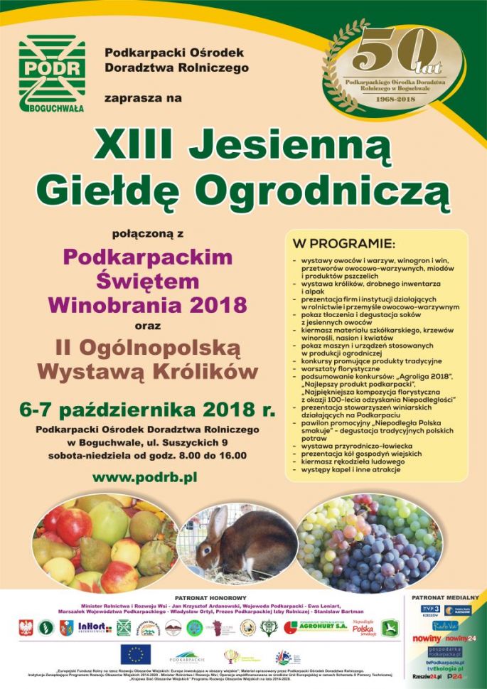 BOGUCHWAŁA. Podkarpacki Ośrodek Doradztwa Rolniczego w Boguchwale zaprasza w dniach 6-7 października 2018 roku na XIII Jesienną Giełdę Ogrodniczą oraz Podkarpackie Święto Winobrania połączone z Ogólnopolską Wystawą Królików, która odbędzie się w Boguchwale.