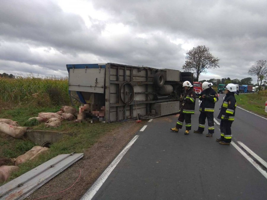 Do zdarzenia doszło po godz. 9 na drodze krajowej nr 77 w miejscowości Dębno w powiecie leżajskim. Ze wstępnych ustaleń wnika, że od ciężarówki przewożącej trzodę chlewną odpięła się naczepa, która przewróciła się na bok. Część świń wydostała się z uszkodzonej naczepy i rozeszła po pobliskich polach.