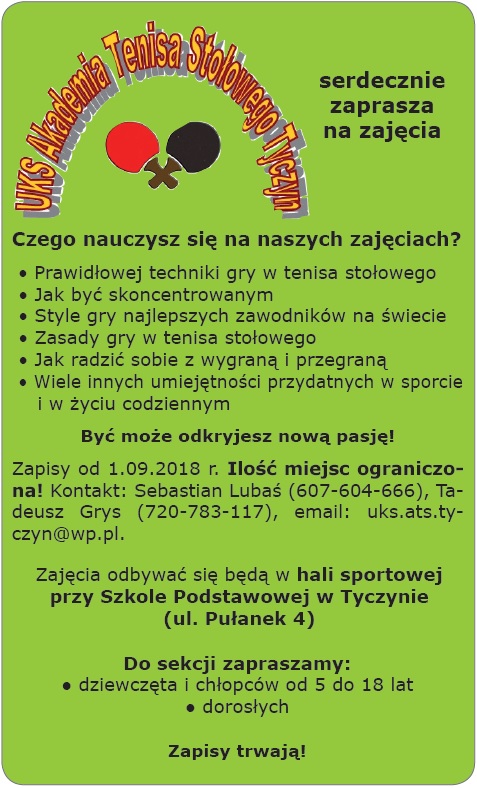 Nowe informacje dotyczące szkółki, pojawiać się będą już wkrótce na fanpage?u na Facebooku (UKS Akademia Tenisa Stołowego Tyczyn). Zainteresowani mogą się skontaktować poprzez stronę na Facebooku, email: (uks.ats.tyczyn@wp.pl) oraz telefonicznie pod nr: 607-604-666 (Sebastian Lubaś) lub 720-783-117 (Tadeusz Grys).